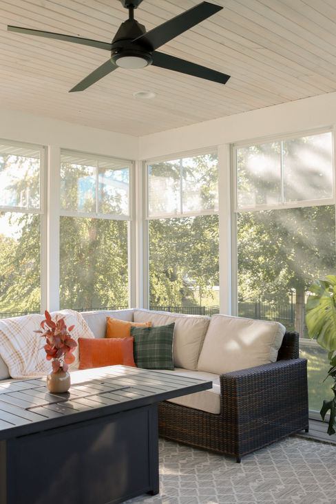 Three Season Porch, Scandi Wall Cladding, French Doors into Dining Room, Floor to Ceiling Windows